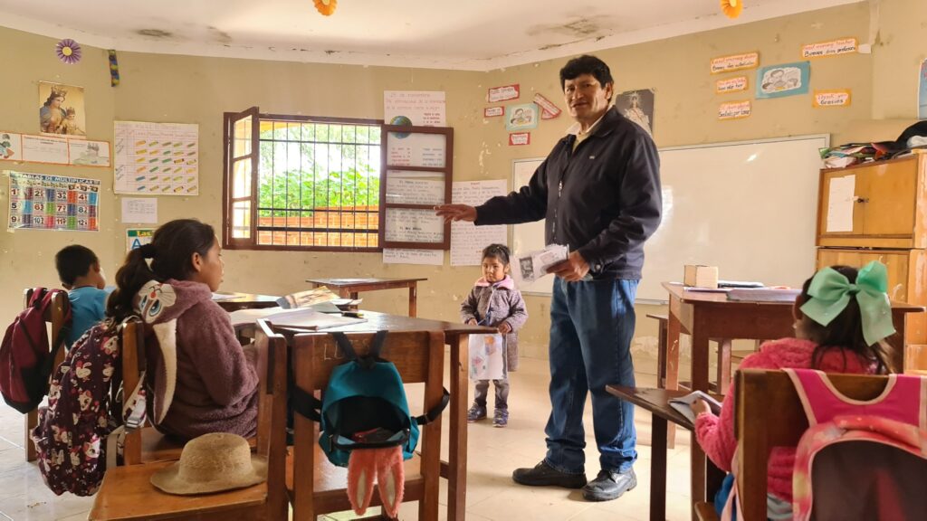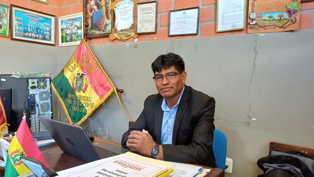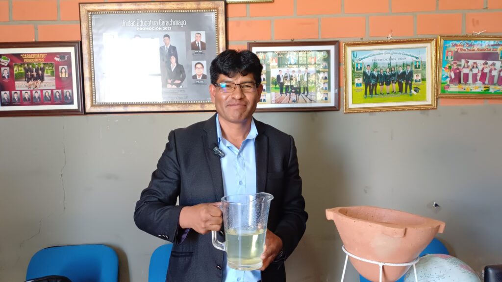 En un aula de seis estudiantes de distintas edades, en la comunidad de Carachimayo, un maestro de 54 años carga cada dos semanas, desde su casa—a un par de kilómetros de distancia—, un botellón con agua tratada. Es para que los niños beban, pues en San Lorenzo del departamento de Tarija, el acceso a agua para consumo seguro es limitado.